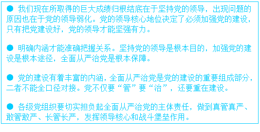 明确内涵才能准确把握关系。坚持党的领导是根本目的,加强党的建设是根本途径,全面从严治党是根本保障。党的建设有着丰富的内涵,全面从严治党是党的建设的重要组成部分,二者不能全口径对接。党不仅要“管”要“治”,还要重在建设。坚持高标准在前,以党的理想信念宗旨为引领,使全体党员向着高标准努力。党风廉政建设和反腐败斗争是全面从严治党的重要组成部分,但也不是全部,不能把二者等同起来。全面从严治党不只是惩处极少数腐败分子,而是要用严明的纪律、严格的监督管全党、治全党。