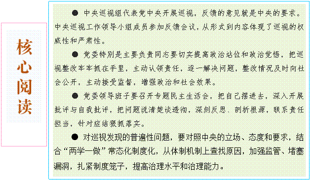 发现问题就要解决问题,做到件件有着落、条条要整改。巡视整改是落实全面从严治党责任的重要内容,主责就在党委,书记是第一责任人。要以巡视整改为契机,强化“四个意识”,举一反三找到差距,加强领导和管理,推动改革、促进发展,把党中央的大政方针和决策部署落到实处。
