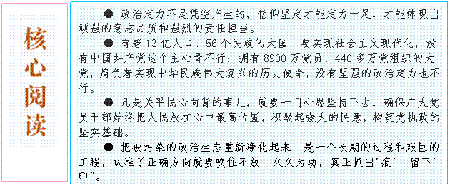 定力来自不变的信念。中国共产党的权力是人民赋予的,党的性质和宗旨决定了,必须从民心向背出发,把全面从严治党抓紧抓好,净化党内政治生态,不断增强人民群众对党的信心、信任和信赖。