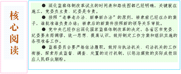 深化监察体制改革试点的时间表和路线图都已经明确,关键就在施工,党委负主责、纪委是专责。监察体制改革试点地区党委、纪委牢固树立“四个意识”,切实担当起政治责任,加强党的统一领导,制定详细改革方案,选好配强监委领导班子,确保党中央决策部署的实现。千难万难,一把手重视就不难。试点工作进展顺利,一个重要经验就是党委书记站到改革第一线,亲自挂帅、亲力亲为,对机构设立、职能调整和人员配置等难点问题重点研究、认真解决。着力抓好试点工作组织实施和任务落实,牢牢抓住转隶这个关键环节,将检察机关反贪、反渎等部门人员整体划转,保证人员先到位,把活儿揽起来,再统筹机构设置、人员安排,从而最大程度减少摩擦和阻力。