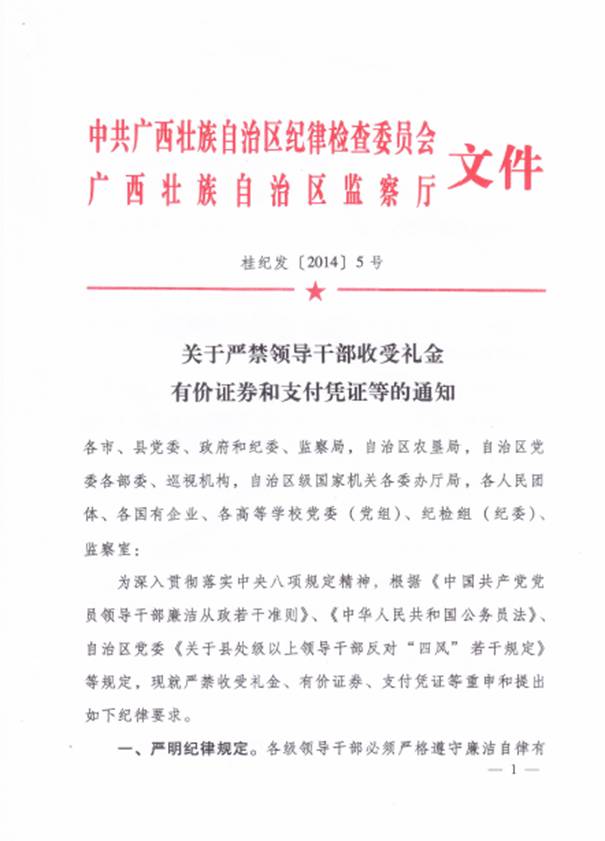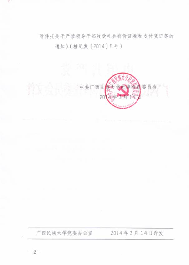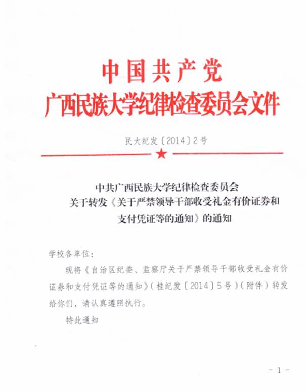 中共广西民族大学纪律检查委员会关于转发《关于严禁领导干部收受礼金有价证券和支付凭证等的通知》的通知(民大纪发[2014]2号 )