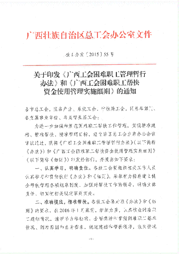 桂工办发〔2015〕55号 《广西工会困难职工管理暂行办法》和《广西工会困难职工帮扶资金使用管理实施细则》.pdf